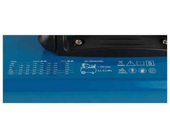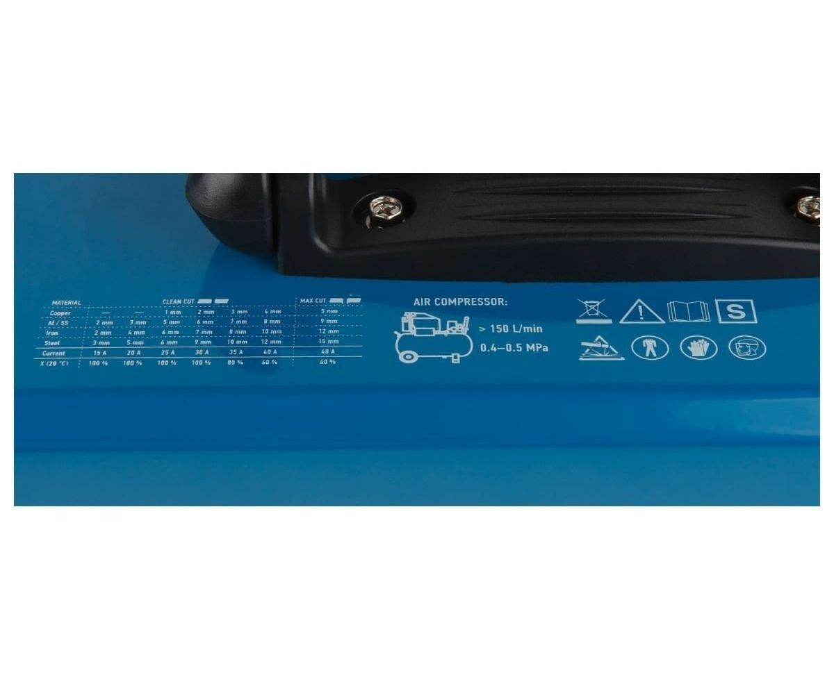 Внимание! Аппарат поставляется без вилки! В случае работы на максимальных токах, аппарат необходимо оснащать силовой однофазной вилкой 32 А 220 В. Требует подключения к воздушному компрессору с производительностью воздуха не менее 150 л/мин.
