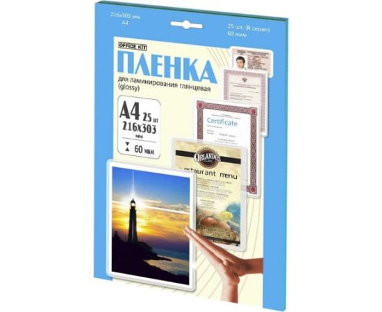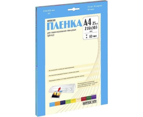 Ламинационная пленка Office Kit Retail pack А4 60 мик 25 шт в упаковке глянцевая LPA460 наносится на фотографии и документы.