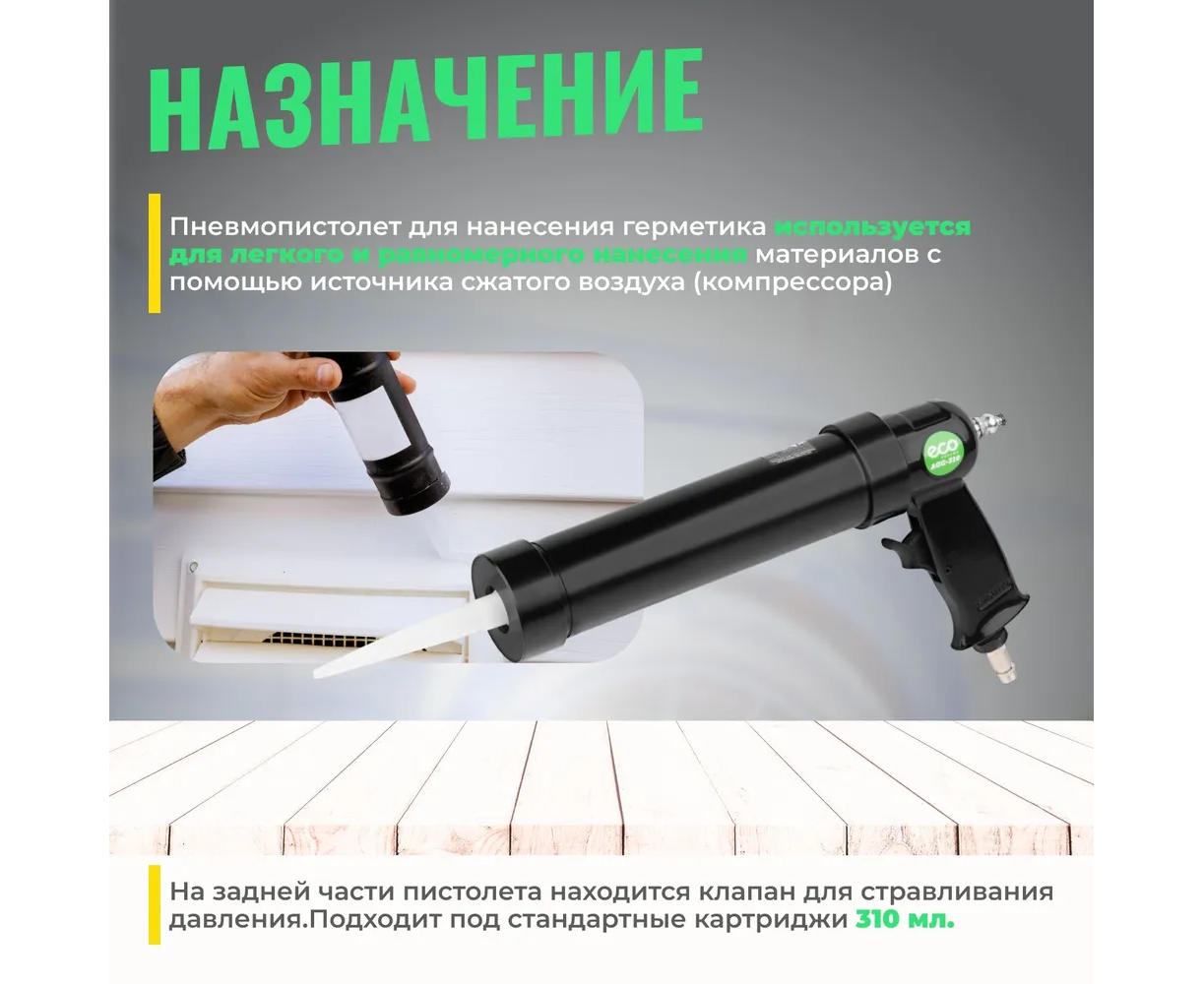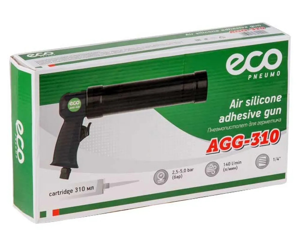 Пневмопистолет для герметика ECO AGG-310 используется для легкого и равномерного нанесения материалов с помощью источника сжатого воздуха (компрессора).