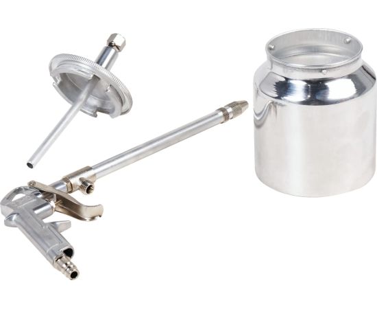 Пистолет изготовлен из металла. Имеет быстросъёмный бачок для распыляемого состава с байонетным присоединением. Прочный металлический корпус устойчив к повреждениям.