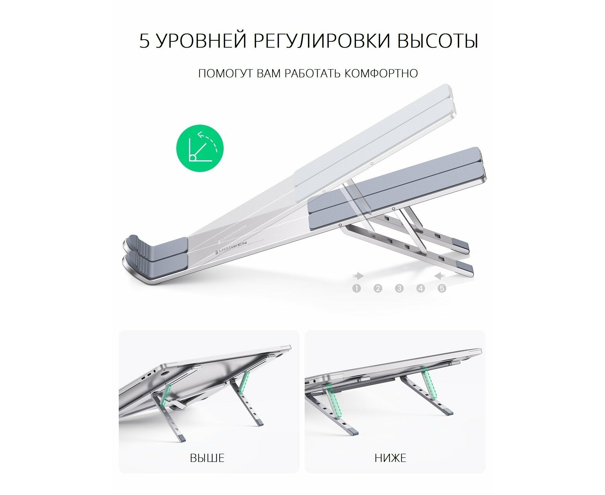 Подставку можно регулировать по 5 уровням. Он поднимает ваш ноутбук на идеальный для вас уровень и сводит к минимуму проблемы усталости шеи и глаз и болей в спине. Эргономичный дизайн позволяет легко и удобно просматривать любой контент и печатать, подходит для дизайнеров, инженеров, программистов и людей, которые проводят долгие часы перед ноутбуком.