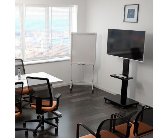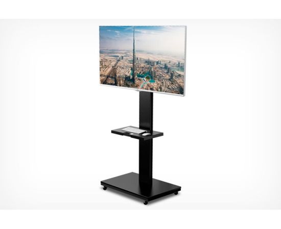Телевизор 25кг 65 диагональ, - повесил без проблем! Катится легко, но стояночных фиксаторов нет. Да они и не нужны, стойка и так под весом стоит устойчиво.