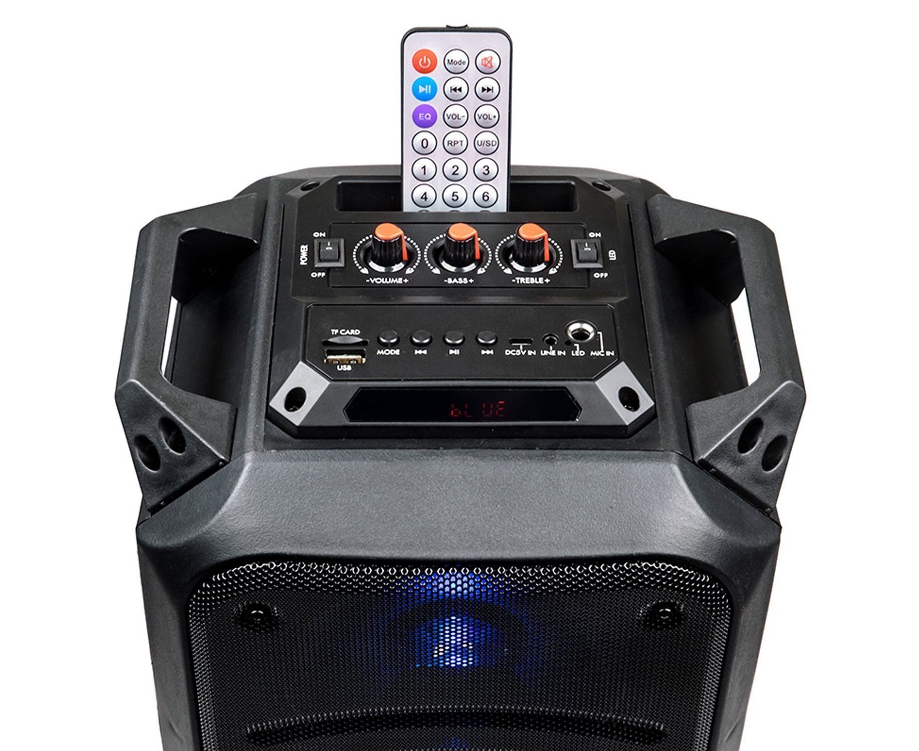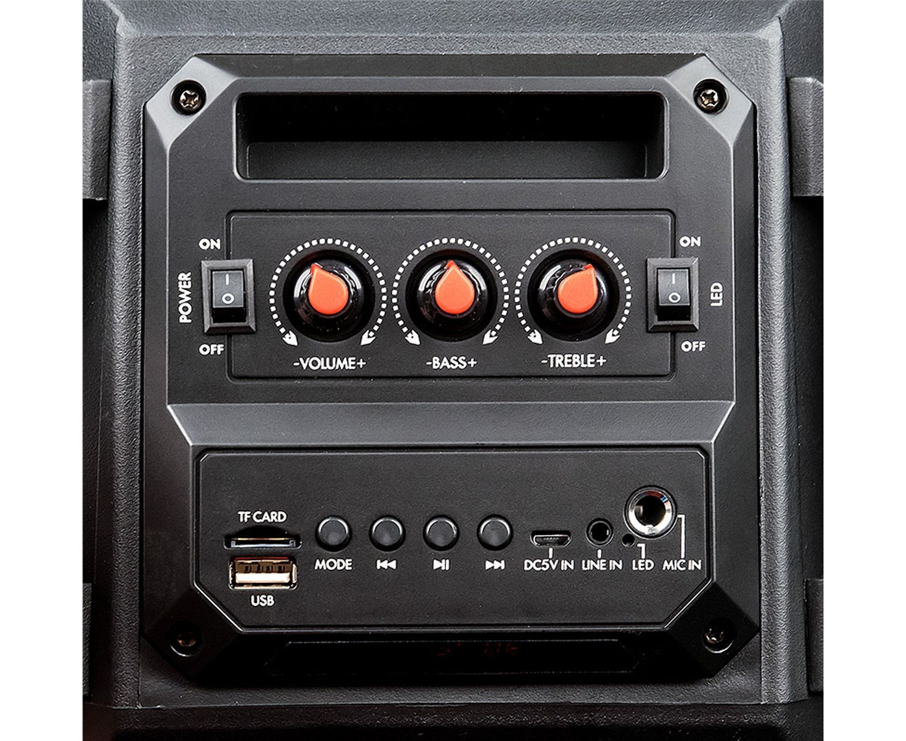 Управление - на верхней панели: питание вкл/выкл, подсветка вкл/выкл, следующая запись/радиостанция, предыдущая запись/радиостанция, воспроизведение/пауза, выбор режима (источника звука). Регуляторы: громкость общая, НЧ, ВЧ