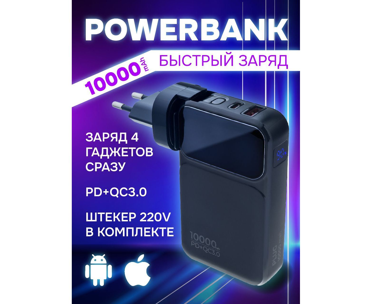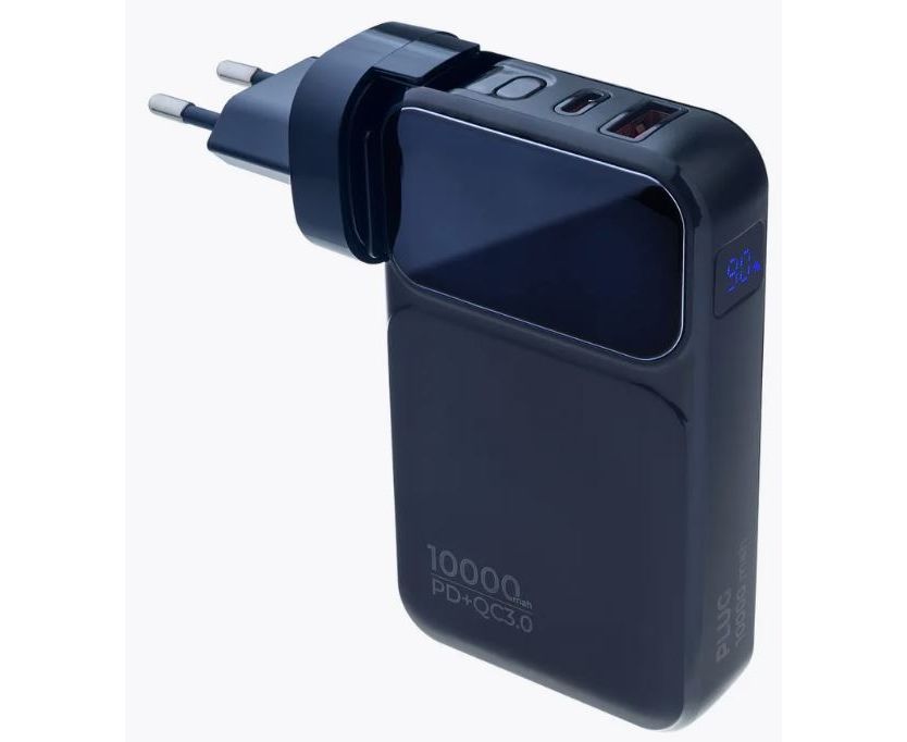 Распродажа! Пауэрбанка Perfeo PLUG 10000 mAh/LED дисплей/Вход 230V/PD+QC 3.0/Выход: 5A, max 22.5W/ цвет - черный