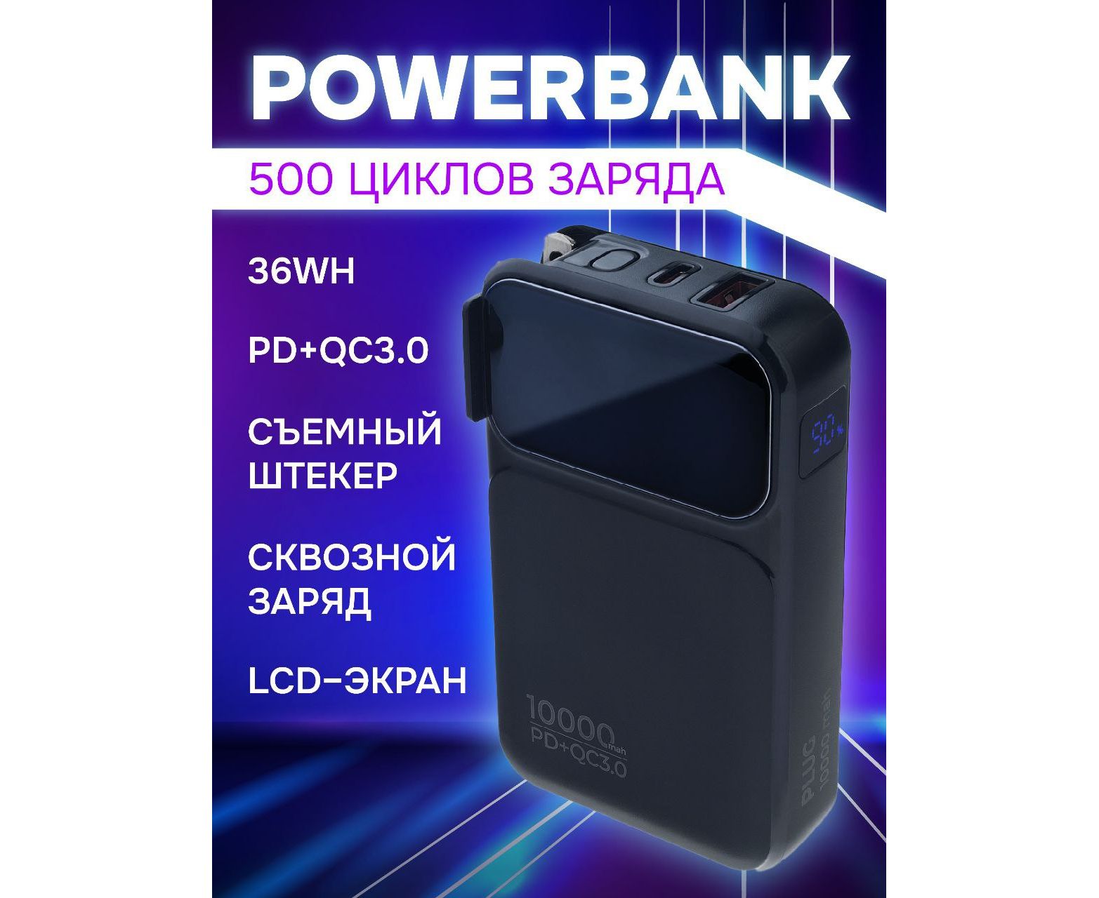 Энергоёмкость устройства - 10000 мА⋅ч (36 Вт⋅ч)