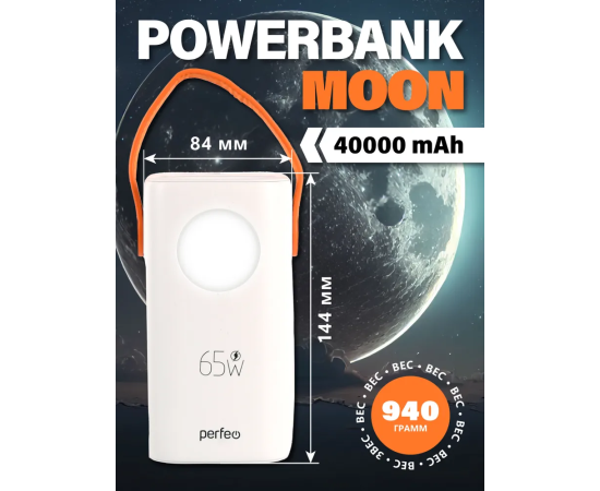 Powerbank Perfeo PF_E1635 Moon 65W 40000 mAh/LED дисплей/PD+QC 3.0/2Type-C/2 USB/,max 65W/White