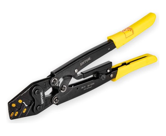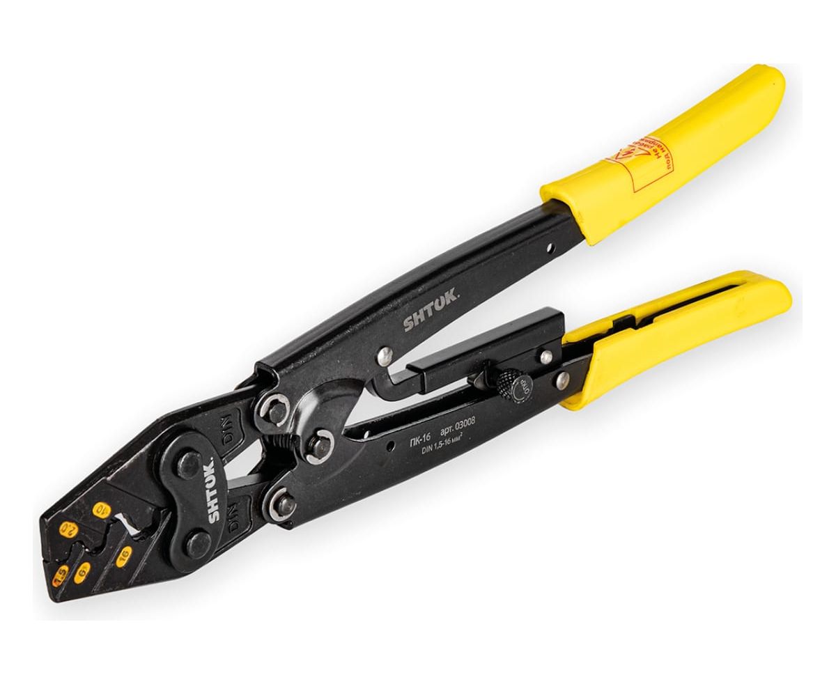 1.Особая конструкция ручных пресс-клещей SHTOK ПК-16 03008 плотно зажимает кабель, не давая ему "выйти" из рабочей области. Минимальная площадь опрессовки 1 мм.