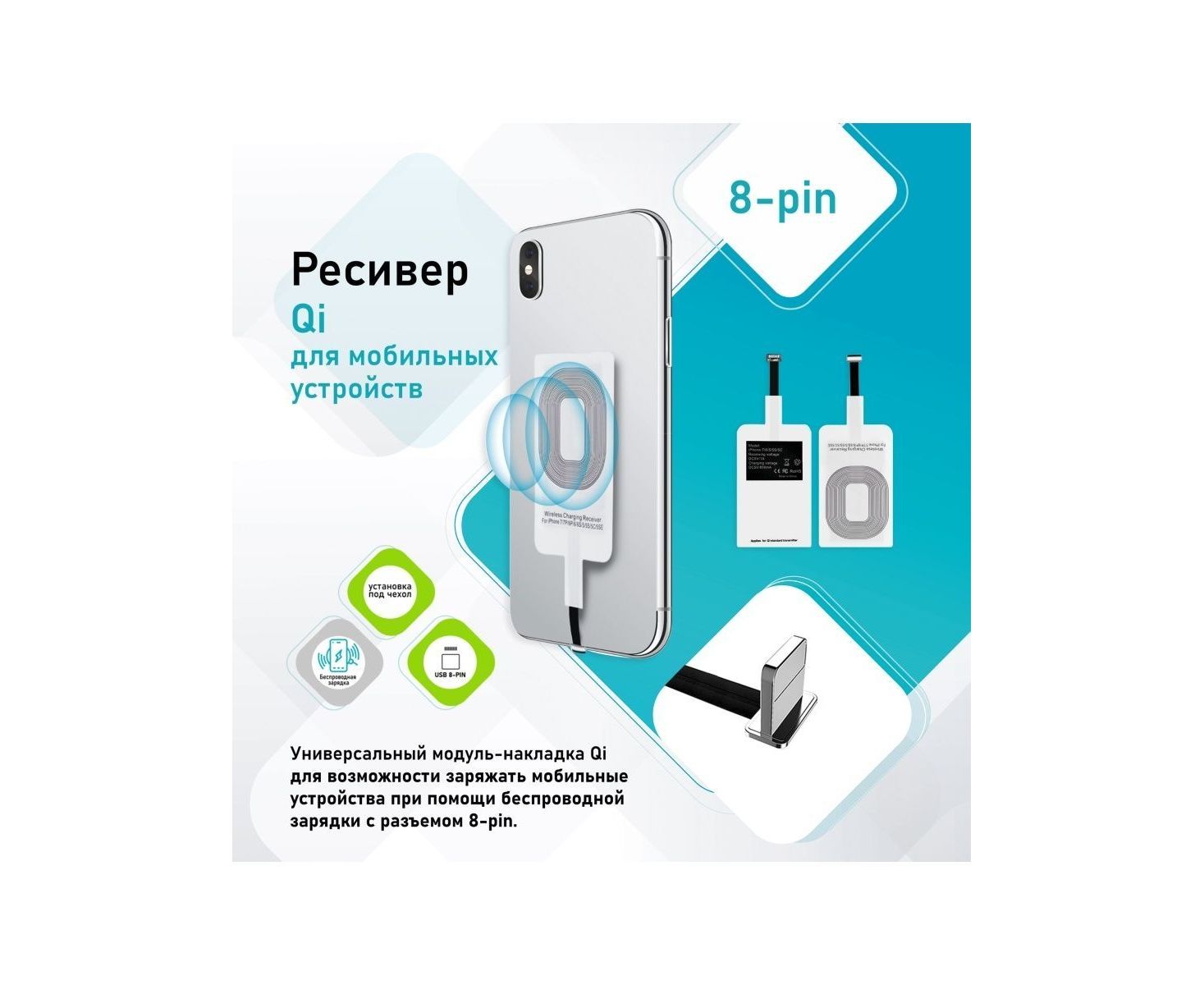 Универсальный модуль-накладка QI для возможности заряжать мобильные устройства при помощи беспроводной зарядки.