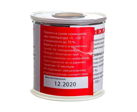 Припой с канифолью REXANT представляет собой проволоку (диаметром 0,8 мм) из сплава олова (60 %) и свинца (40 %).