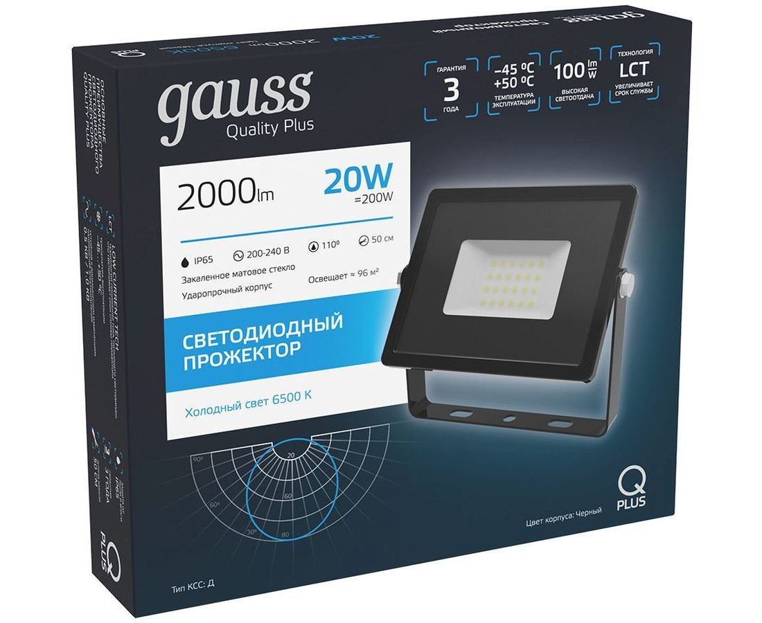 Прожектор Gauss Qplus уличный светодиодный 20Вт корп.алюм.черный (613511320)