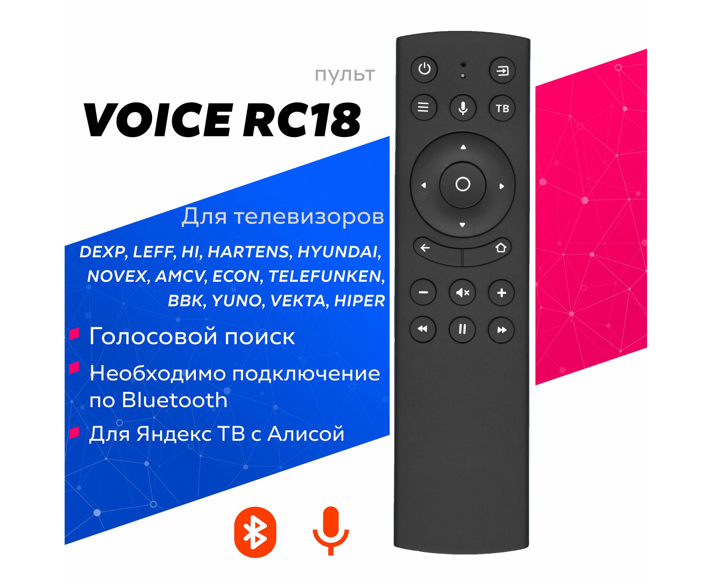 Голосовой телевизионный пульт дистанционного управления Huayu VOICE RC18 для телевизоров DEXP; Hyunda; Novex; HI; Telefunken; Leff; AMCV; ECON; YUNO; Vekta; BBK; HIPER; Hartens с операционной системой (на платформе) Яндекс.ТВ. Для работы голосового поиска и использования всех возможностей Яндекс ТВ с поддержкой голосового помощника Алиса необходимо подключить пульт ДУ по Bluetooth в настройках вашего TV.
