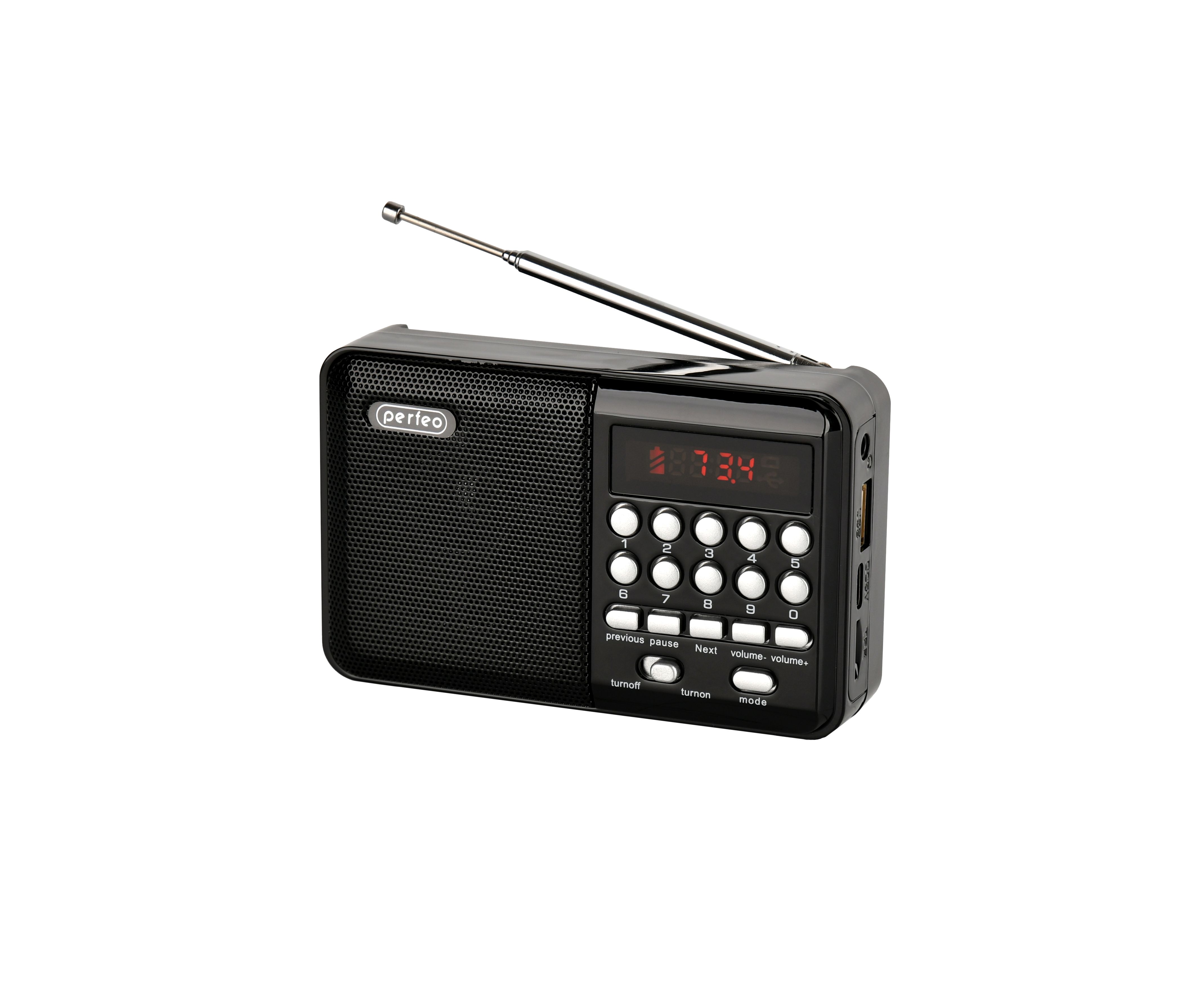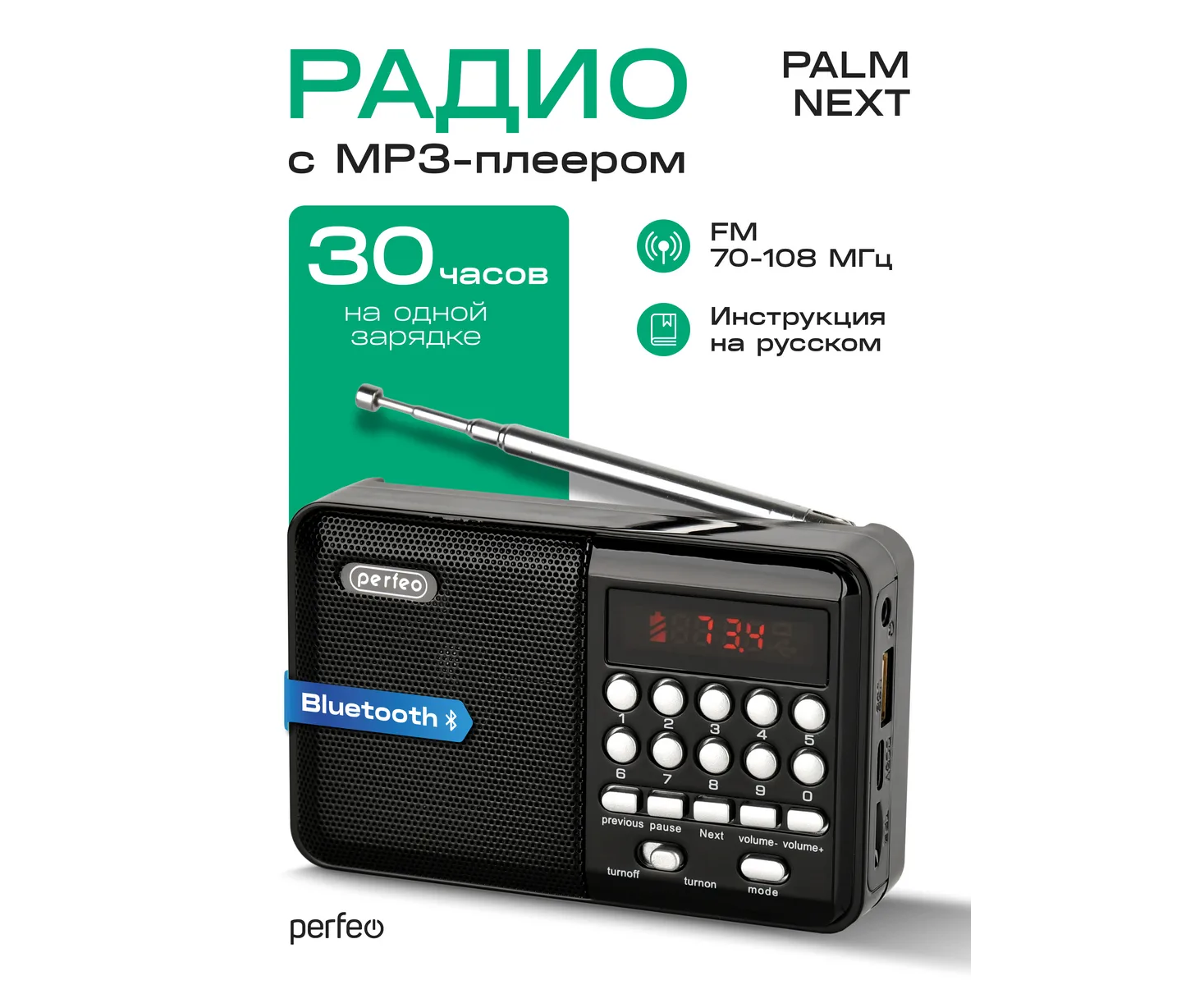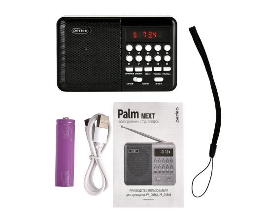 Радиоприемник цифровой Perfeo PALM (i90). Радио с расширенным функционалом умеет воспроизводит MP3-файлы с карт памяти и USB-флэшек. Приемник может работать не только от аккумуляторов (18650), но и от адаптера для зарядки (в комплект не входит) подключенного в сеть 220В. Радиоприемник от сети имеет встроенное цифровой тюнер FM (87,5 – 108 МГц) с автоматическим поиском станций. Радио оснащено поворотной телескопической антенной, возможность воспроизведения музыки с USB flash и microSD карт памяти, вход AUX для подключения источника звука. LED-дисплеем (отображает номера mp3-треков и частоту радиостанции). В комплекте идет кабель miniUSB для зарядки радиоприемника. Радиоприемник мини компактного размера удобно переносить, он помещается в карман. Это радио на аккумуляторе можно слушать даже ночью и не беспокоится, что можно кого-то разбудить, ведь у колонки с радио есть разъем для наушников. Радио PALM – отличный попутчик для поездок, путешествий и прогулок. Радиоприемник от сети и аккумулятора - легкий, удобный, компактный и многофункциональный, не займет много места и не оставит вас без любимой музыки. В нашем ассортименте магазина Perfeo есть множество портативных радиоприемников, они станут отличным подарком для родителей, дедушек и бабушек, подарят хорошее настроение и станут украшением вашего интерьера, прекрасно впишутся в любой дизайн, как дома, так и на даче, незаменимы в походе. Радиоприемник легко зарядить от повербанка, он не прихотлив в использовании.