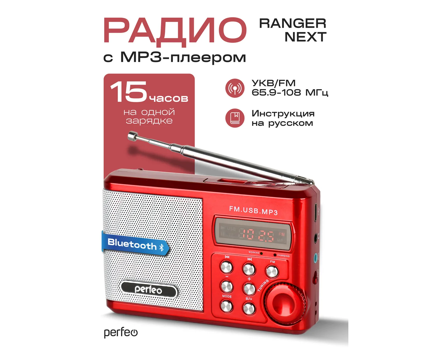 Радиоприемник Bluetooth цифровой Perfeo Sound Ranger Next/ УКВ+FM/ MP3/ Bluetooth 5.3/ 1000 mAh/ Красный, (Арт. PF_D0563)