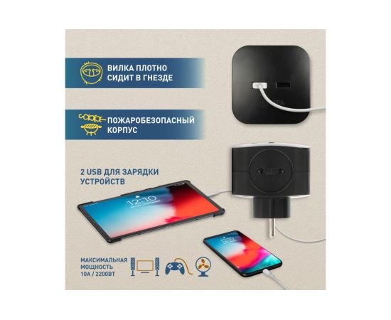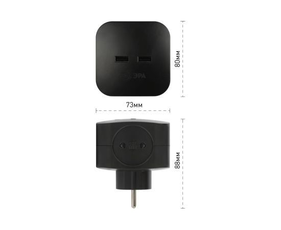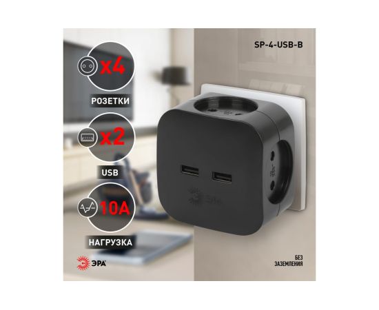 Технические характеристики ЭРА SP4USBB на 4 розетки 220V 2xUSB 2400mA, без заземл 10А (черный) Б0049536