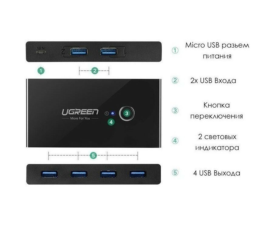 Разветвитель портов UGREEN US216 (30768) 2 In 4 Out USB 3.0 Sharing Switch Box. Цвет: черный