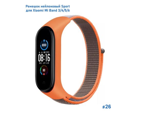 Ремешок нейлоновый Great Case Sport для Xiaomi Mi Band 3/4/5/6/7, 260мм, на липучке, оранжевый+серый (26)