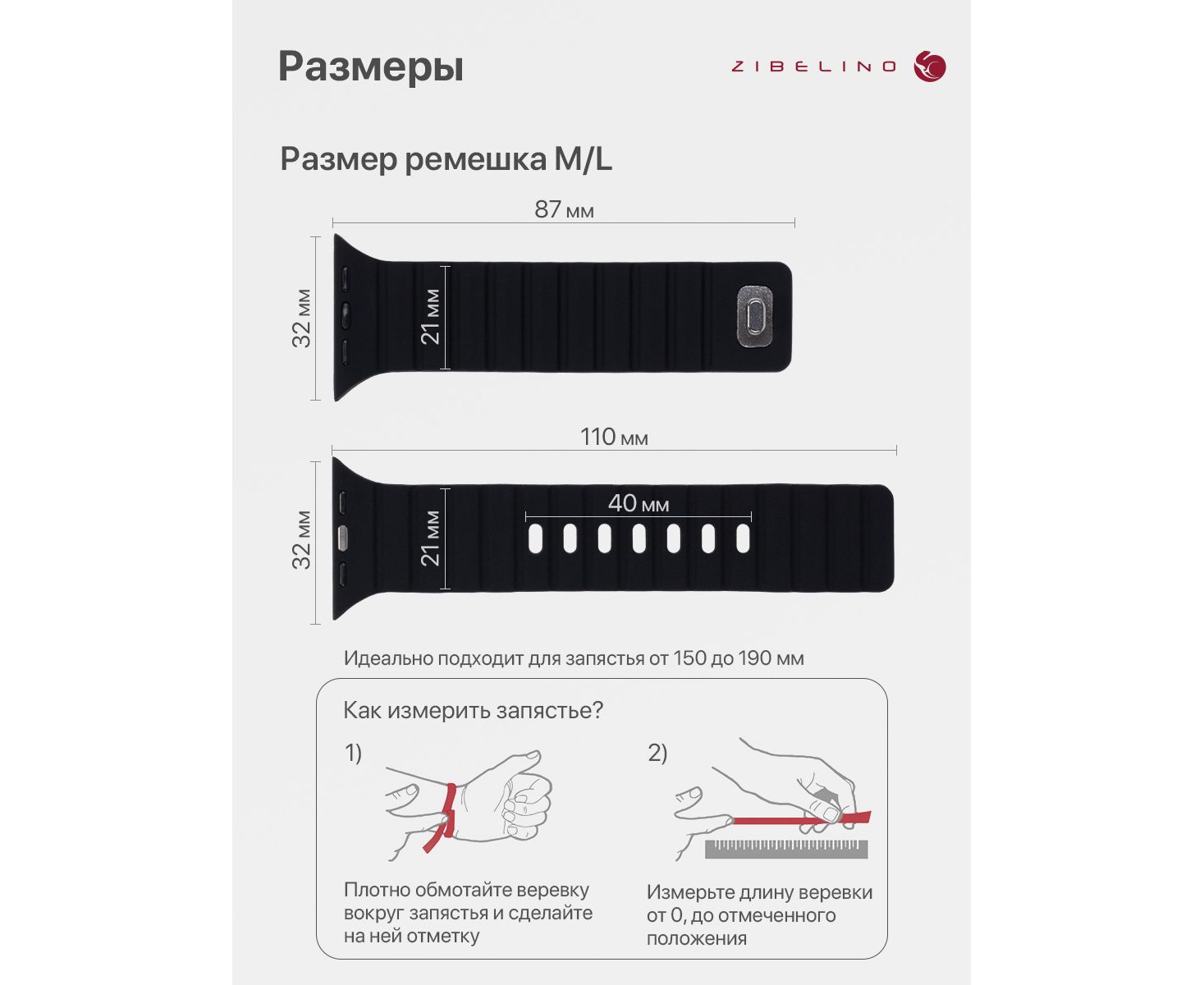 Ремешок размера M/L подходит для запястья обхватом от 15 до 19 см. Размер ремешка 195x21x2мм.
