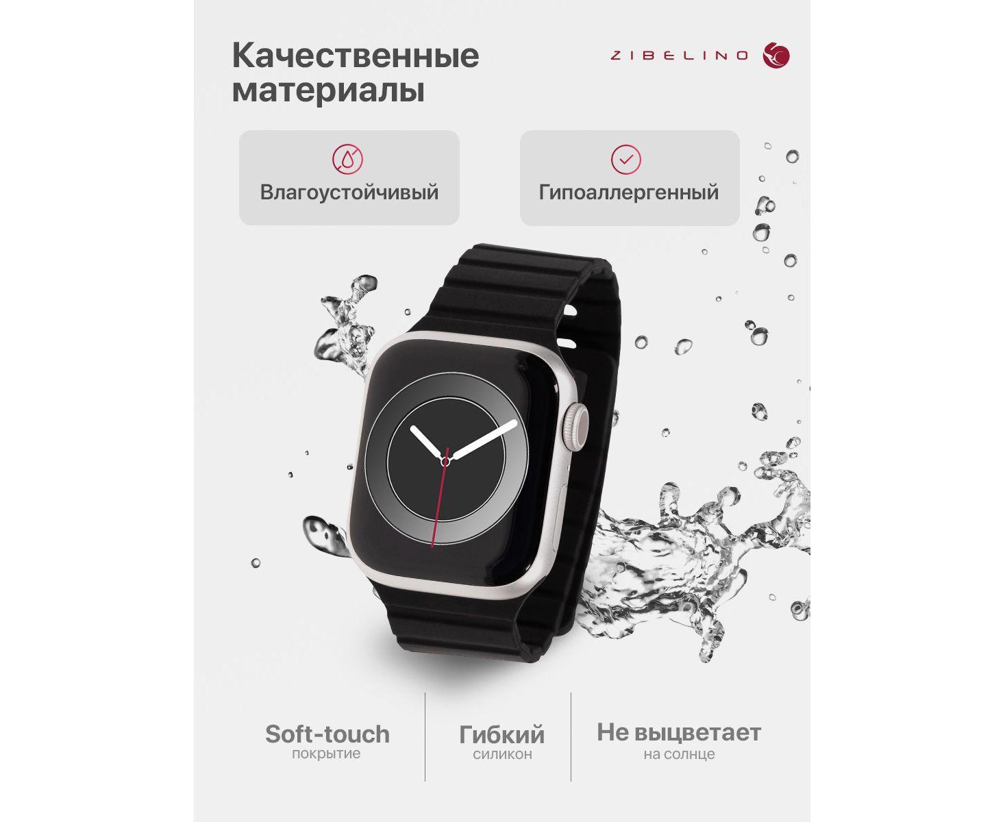 - Комфорт и гигиеничность: гипоаллергенный силикон браслета Apple Watch с soft touch покрытием мягкий, гладкий и приятный на ощупь. Не натирает кожу даже при длительном ношении.