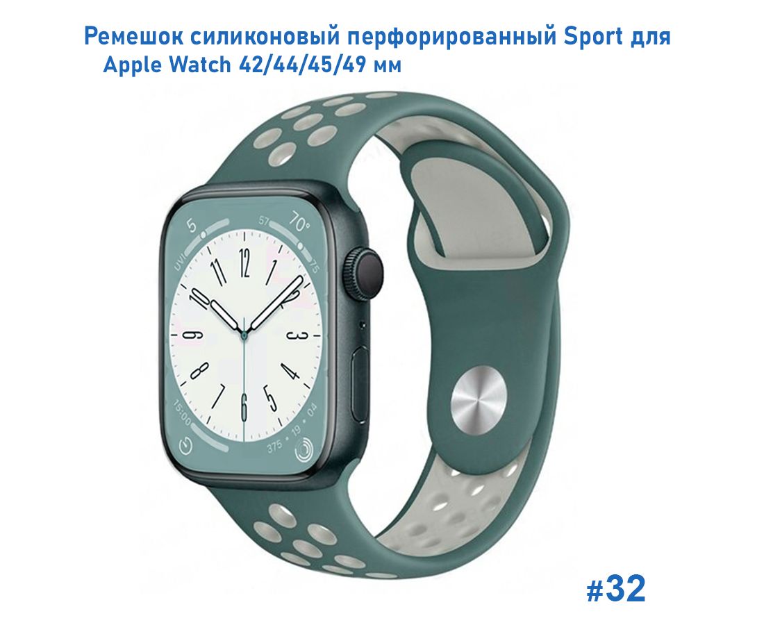 Ремешок силиконовый перфорированный Great Case Sport NK для Apple Watch 42/44/45/49 мм, 235мм, на кнопке, зеленый кактус+серый (32)