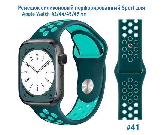 Ремешок силиконовый перфорированный Great Case Sport NK для Apple Watch 42/44/45/49 мм, 235мм, на кнопке, темно-зеленый+мятный (41)