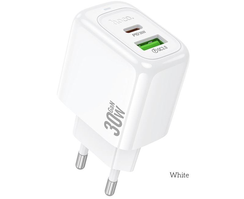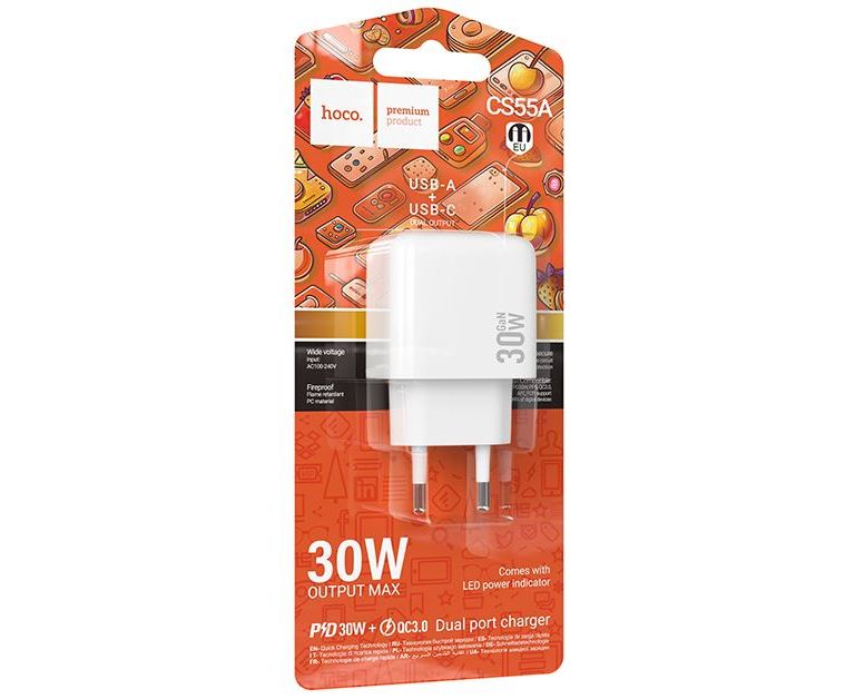 Сетевое зарядное устройство HOCO CS55A/ СЗУ/ PD + QC 3.0/ 2 USB: Type-C + Type-A/ Выход: 30W+18W/ Белый