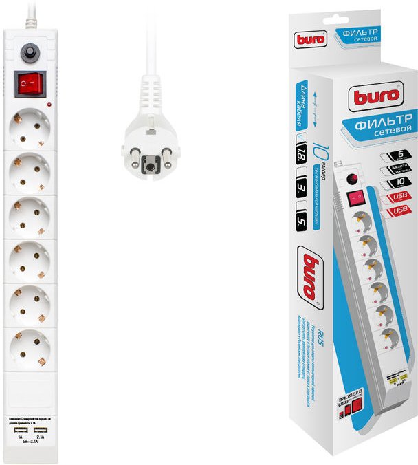 сетевой фильтр, 6 розеток, два USB-порта для зарядки (2.1A + 1A), максимальная нагрузка: 2200 Вт, максимальный ток нагрузки: 10A, максимальная рассеиваемая энергия: 107 Дж, шнур 3м