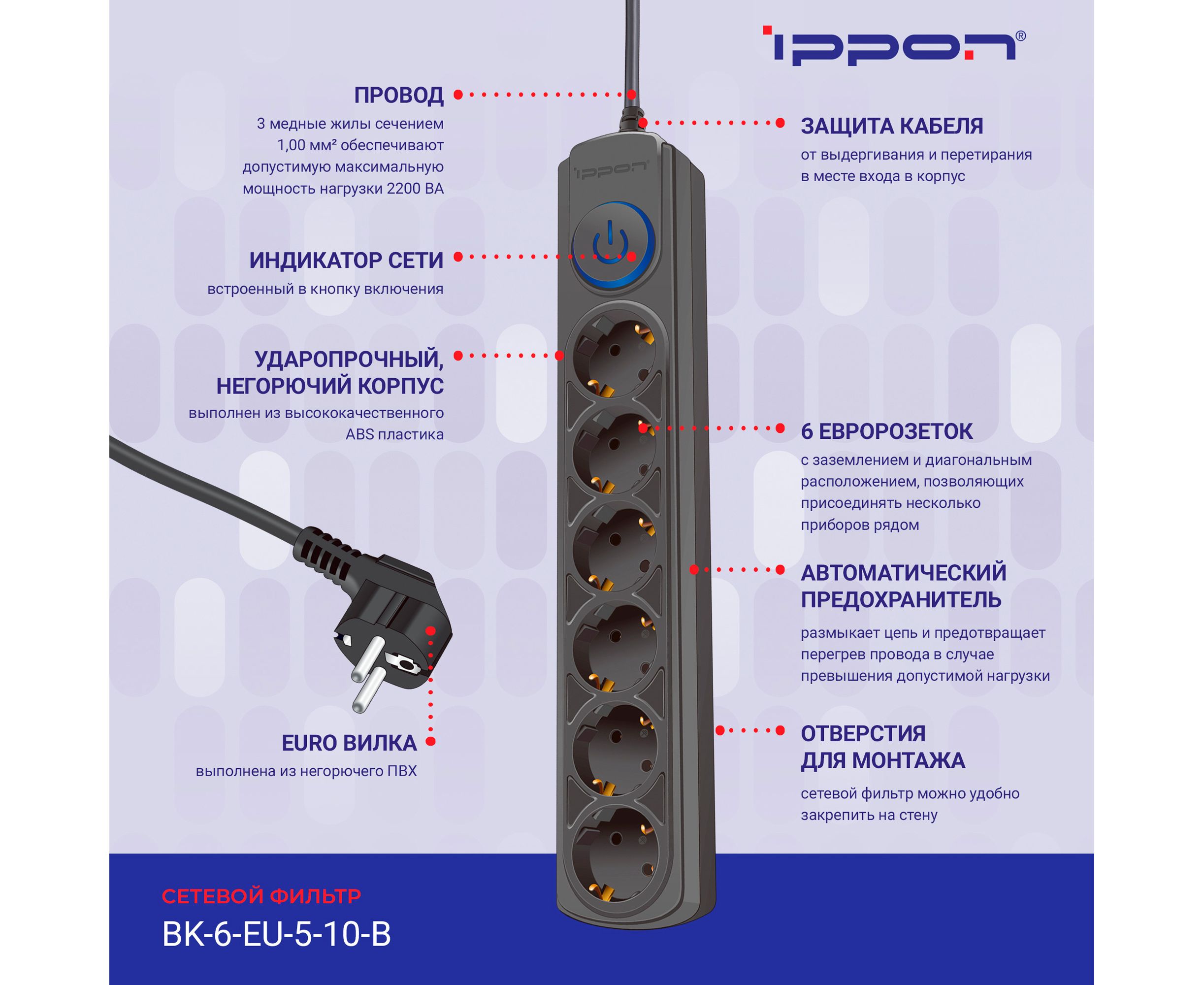 Сетевой фильтр Ippon BK-6-EU-5-10-B (5м 6 розеток черный)