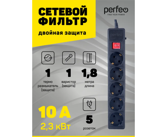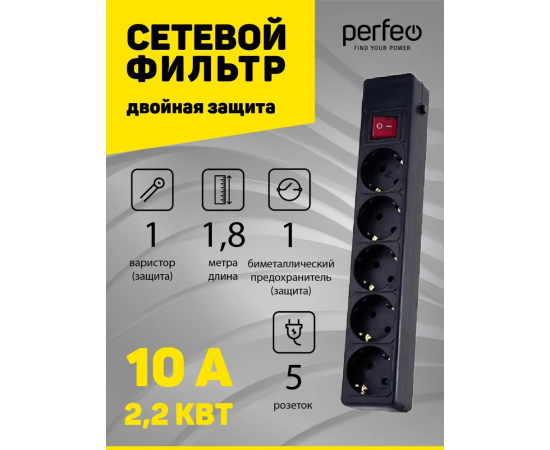 Сетевой фильтр Perfeo "POWER+", 1,8м, 5 розеток, (PF-PP-5/1,8-B), черный
