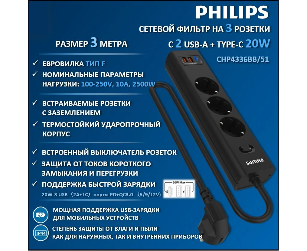 Сетевой фильтр Philips CHP4336BB/51 черный