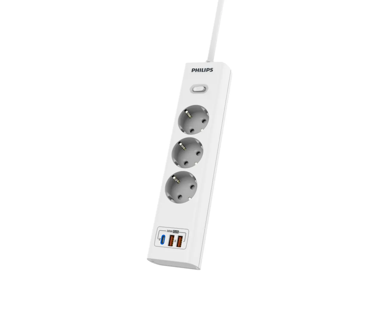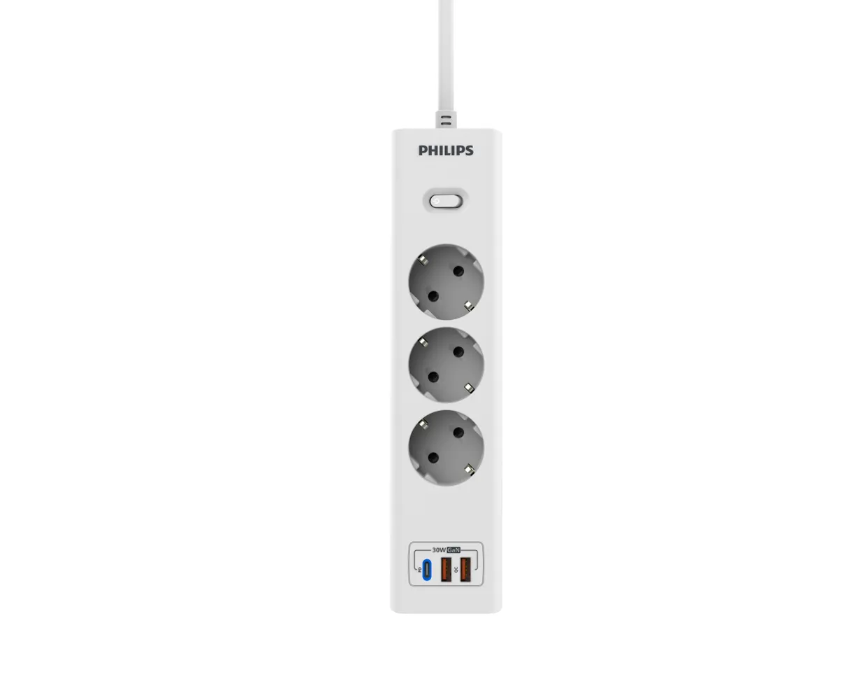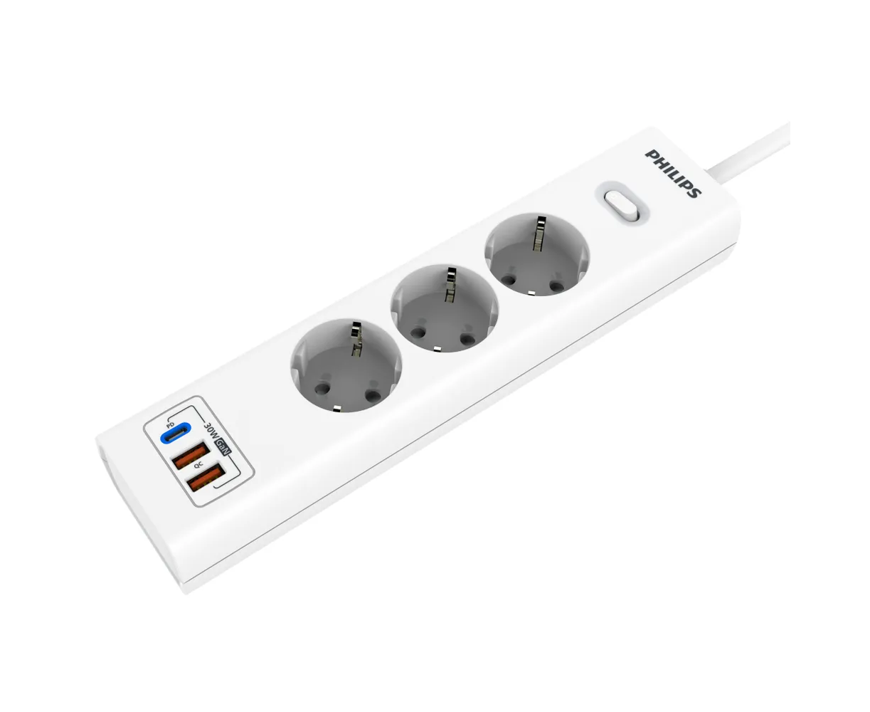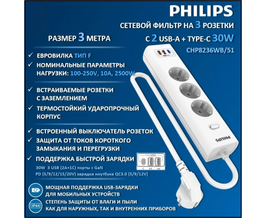 Сетевой фильтр удлинитель Philips CHP8236WB/51 представляет собой удобное устройство, которое позволяет подключать несколько устройств к одной розетке. Этот пилот удлинитель оснащен 3 розетками и 2 USB-А, а также одним портом Type-C, что обеспечивает возможность подключения различных электронных устройств, можно использовать как фильтр для компьютера, а также хорошо подойдет как удлинитель для гирлянды, поэтому он является многофункциональным. Длина разветвителя электрического составляет 3 метра, что позволяет свободно располагать подключенные устройства в нужном месте. Важным преимуществом розетки с выключателем является наличие заземления, которое обеспечивает безопасность и защиту от перегрузок. Тройник с usb 3.0 обладает многофункциональностью, позволяя подключать не только электрические приборы, но и заряжать устройства с помощью USB-портов. Сетевой фильтр Philips обладает передовой технологией быстрой зарядки QC 3.0 - Смартфон непрерывно посылает зарядному устройству информацию о состоянии аккумулятора. На основании этой информации блок питания регулирует выходную мощность, изменяя напряжение и силу тока. Также, благодаря новейшей технологии GaN, этот удлинитель предлагает высокую мощность, занимая при этом минимум места. Сетевые зарядные устройства, в которых используется технология GaN (нитрид галлия), потребляют меньше электрических компонентов и обладают лучшей теплоотдачей. Белый цвет разветвителя с type c придает ему стильный и современный вид, а прочный корпус обеспечивает долговечность и надежность использования. Этот удлинитель силовой идеально подходит для использования дома или в офисе, где требуется подключение и зарядка сразу нескольких устройств. Идеально подойдет для использования дома, гаража, склада, офиса.