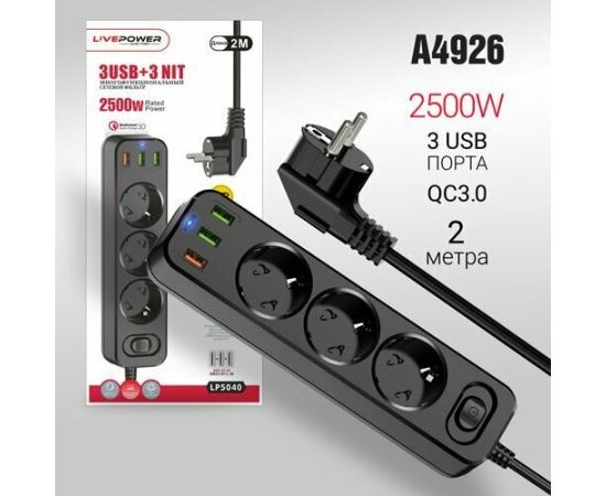 Сетевой фильтр-удлинитель Live-Power LP5040 3USB+QC3.0 + 3 розетки 2000mm Black