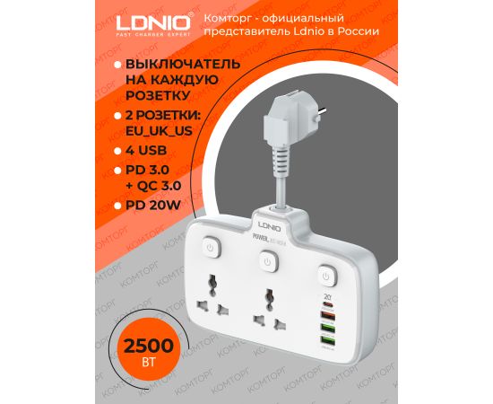 Сетевой разветвитель LDNIO SC2413/ / 2 розетки/ 2500W/ 4 USB: QC 3.0+PD 3.0 20W/ White