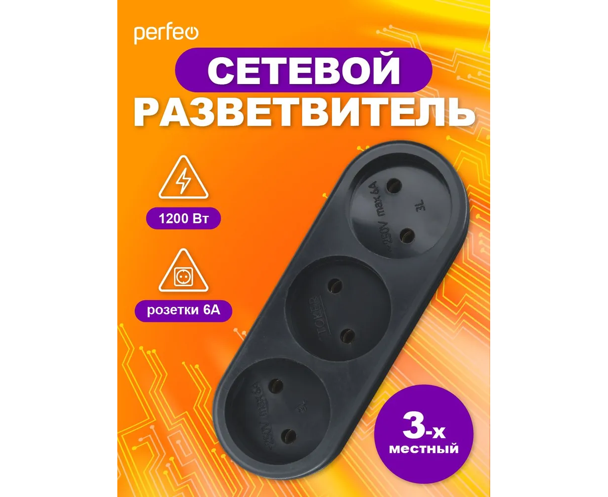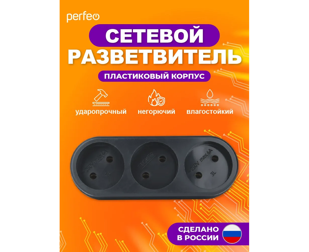 Сетевой разветвитель Perfeo "RU POWER'' 3 гнезда, 6А, без заземления, (3L), черный