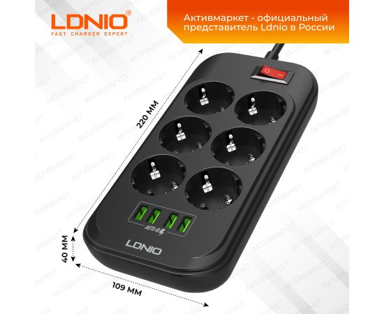 Обратите пожалуйста внимание - эта модель представлена в разных комплектациях - вы можете выбрать длину шнура, мощность, наличие защиты. Данная модель - сетевой удлинитель с функцией умной зарядки Ldnio SE6403 на 6 розеток и 4 USB порта с защитой от перегрузки, короткого замыкания и перегрева. Максимальная мощность подключаемых устройств – 4000 Вт. Удлинитель имеет провод длиной 2 метра, встроенную варисторную защиту от высоковольтных импульсов в сети, единый выключатель, что позволяет удобно регулировать подключенные устройства.. Этот умный тройник с 6 электрическими розетками позволяет подключать не только компьютер и ноутбук, но также и другую технику и аксессуары. Все розетки оснащены специальными защитными шторками от детей – вы можете быть уверены, что никакие посторонние предметы не коснутся контакта под напряжением. 4 USB разъема обеспечивают зарядку электронных гаджетов таких, как телефоны, планшеты, наушники и многие другие. Уникальная технология Auto-ID для USB портов автоматически определяет подключенное устройство и заряжает его максимальным током. В отличие от многих других сетевых фильтров, предлагаемых на рынке, продукция Ldnio изготавливается из специального негорючего пластика, который сохраняет пожаробезопасность до температуры 750 градусов С. Выключатель устройства помогает экономить электроэнергию, а противоскользящие ножки обеспечивают надежность и безопасность при использовании. Благодаря элегантному дизайну и компактным размерам, он легко помещается в любом месте дома и можно использовать как в стационарном положении, так и в путешествиях или командировках.