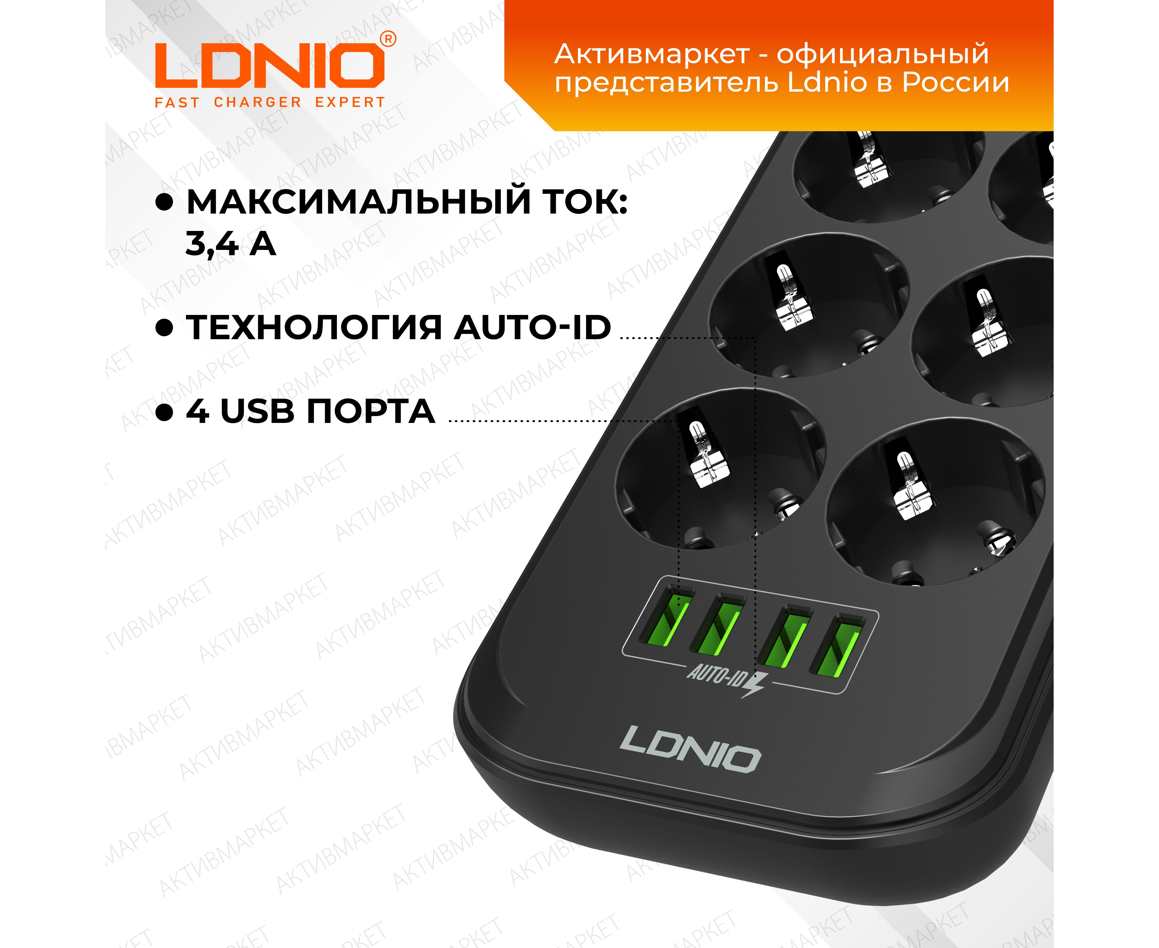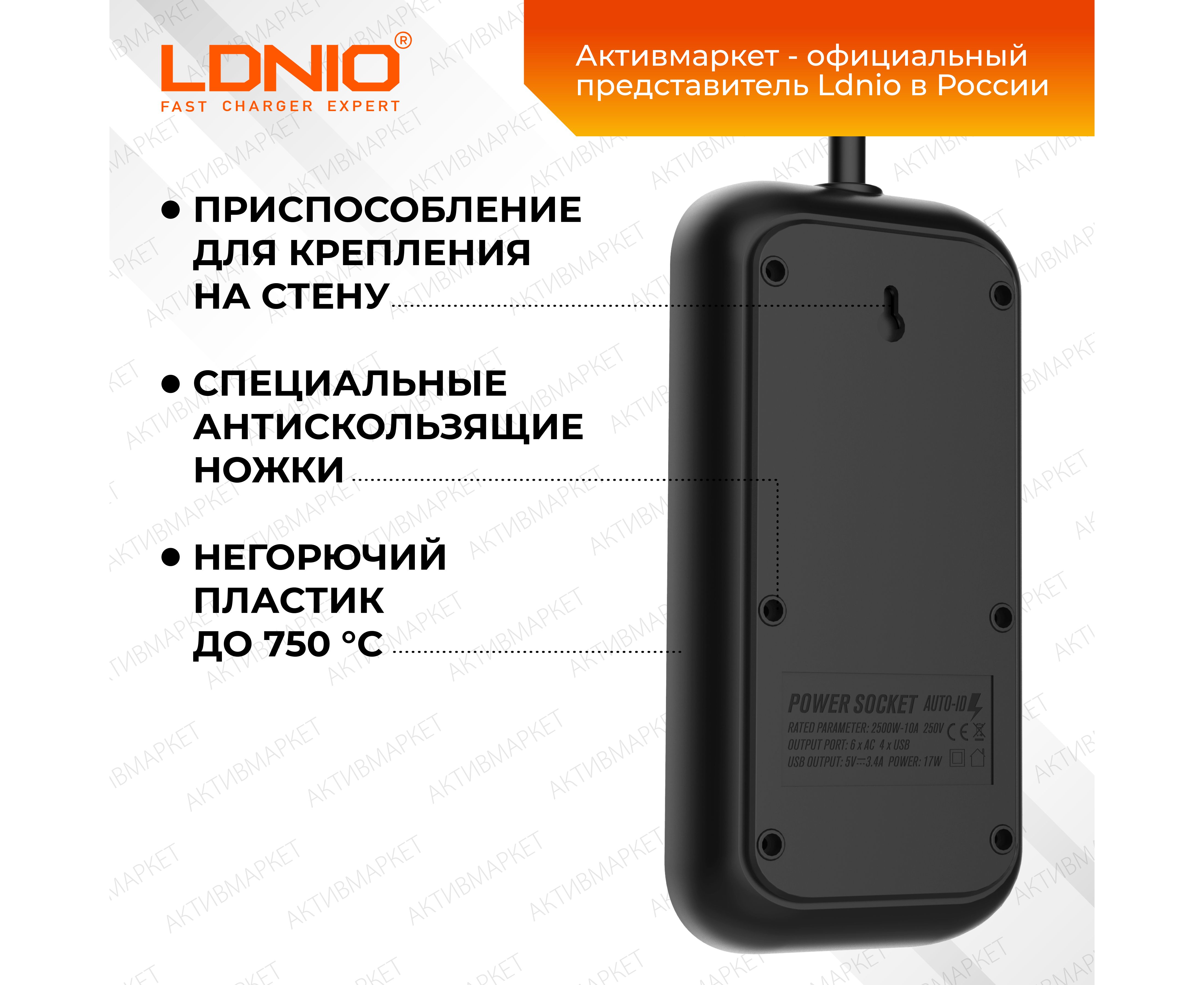 Обратите пожалуйста внимание - эта модель представлена в разных комплектациях - вы можете выбрать длину шнура, мощность, наличие защиты. Данная модель - сетевой удлинитель с функцией умной зарядки Ldnio SE6403 на 6 розеток и 4 USB порта с защитой от перегрузки, короткого замыкания и перегрева. Максимальная мощность подключаемых устройств – 4000 Вт. Удлинитель имеет провод длиной 2 метра, встроенную варисторную защиту от высоковольтных импульсов в сети, единый выключатель, что позволяет удобно регулировать подключенные устройства. Этот умный тройник с 6 электрическими розетками позволяет подключать не только компьютер и ноутбук, но также и другую технику и аксессуары. Все розетки оснащены специальными защитными шторками от детей – вы можете быть уверены, что никакие посторонние предметы не коснутся контакта под напряжением. 4 USB разъема обеспечивают зарядку электронных гаджетов таких, как телефоны, планшеты, наушники и многие другие. Уникальная технология Auto-ID для USB портов автоматически определяет подключенное устройство и заряжает его максимальным током. В отличие от многих других сетевых фильтров, предлагаемых на рынке, продукция Ldnio изготавливается из специального негорючего пластика, который сохраняет пожаробезопасность до температуры 750 градусов С. Выключатель устройства помогает экономить электроэнергию, а противоскользящие ножки обеспечивают надежность и безопасность при использовании. Благодаря элегантному дизайну и компактным размерам, он легко помещается в любом месте дома и можно использовать как в стационарном положении, так и в путешествиях или командировках.