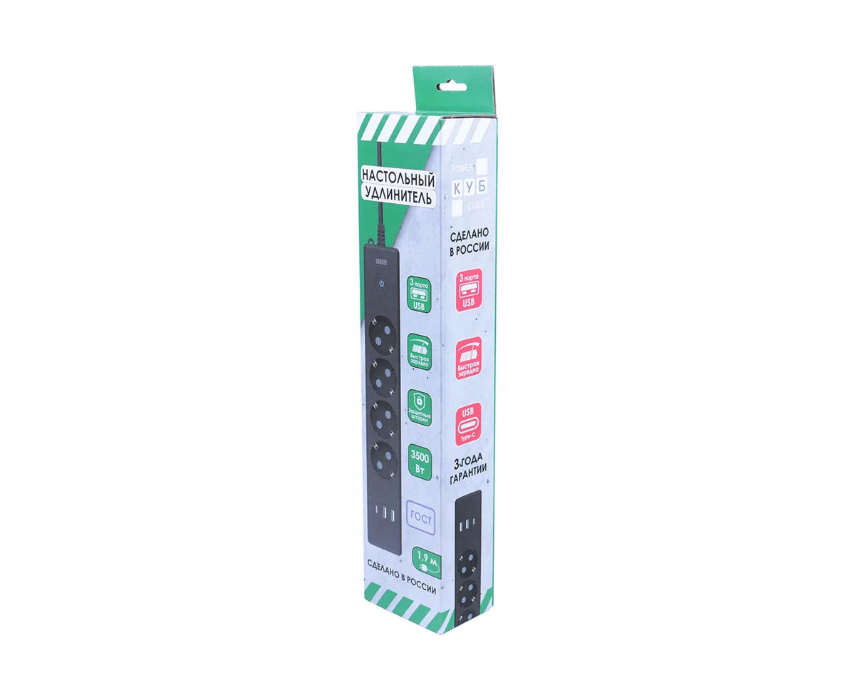 Сетевой удлинитель Power Cube PC-7B-2M 1.9м (4 розетки) черный (коробка)