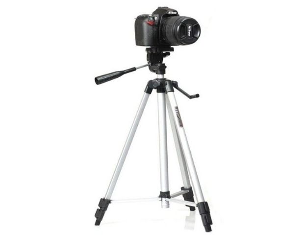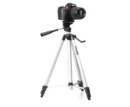 Штатив-тренога из алюминиевого сплава, раздвижной (с регулировкой высоты) от 50 до 135 см. Количество выдвижных секций ножек - 4. Максимальная нагрузка до 3 кг. В штатив встроен уровень, положение штативной головки регулируется при помощи ручки. Штативная головка вращается на 360 градусов.