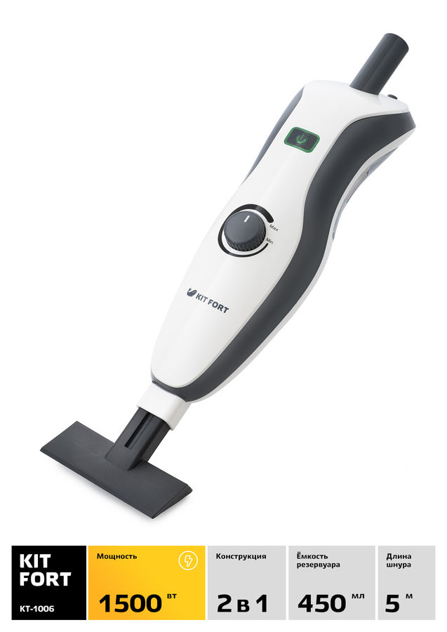 Особенности: Принцип действия парогенератор Kitfort KT-1006 основан на воздействии горячего пара на загрязнения. Пар проникает внутрь загрязнения, размягчая и растворяя его, а затем с помощью тряпки или щетки частички грязи смываются. Высокая температура пара весьма способствует процессу очистки.