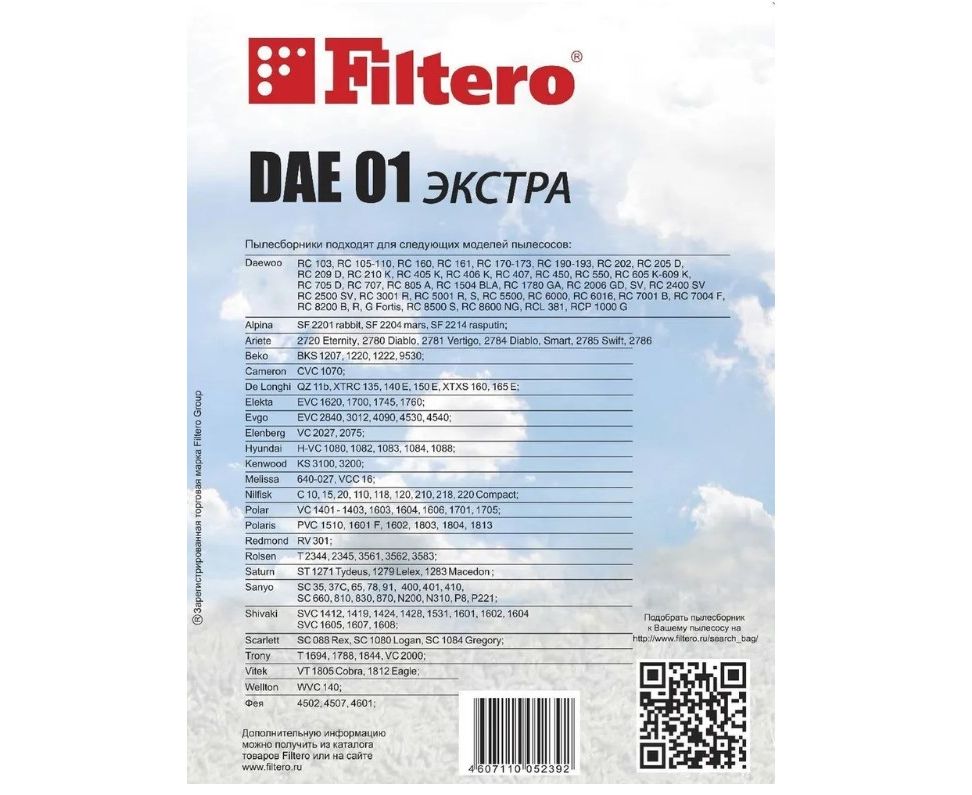 Пылесборник FILTERO DAE 01 (4) экстра. Мешки-пылесборники Filtero DAE 01 ЭКСТРА Anti-Allergen, 4 штуки. Пылесборники Filtero ЭКСТРА Anti-Allergen произведены из синтетического микроволокна MicroFib с антибактериальной пропиткой Anti-Bac. Очень прочные, они не боятся острых предметов и влаги, собирают больше пыли (до 50%) и обеспечивают уровень очистки воздуха 99,9%, а также задерживают бактерии и препятствуют их распространению. При этом мощность всасывания пылесоса сохраняется в течение всего периода службы пылесборника.