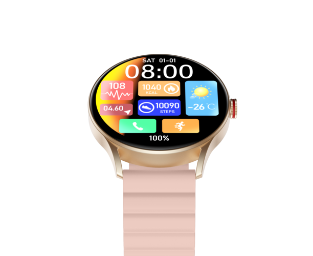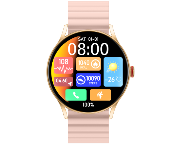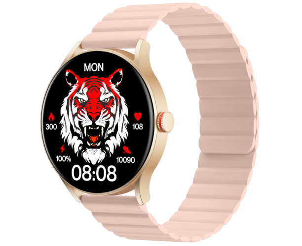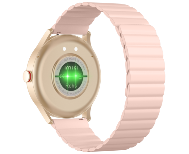 Смарт-часы iMiKi TG1 выполнены в золотистом металлическом корпусе с защитой от пыли, влаги и воды IP68. Силиконовый розовый ремешок комфортно облегает запястье. На круглом дисплее диагональю 1.43 дюйма в любых условиях освещенности передается четкая контрастная картинка.