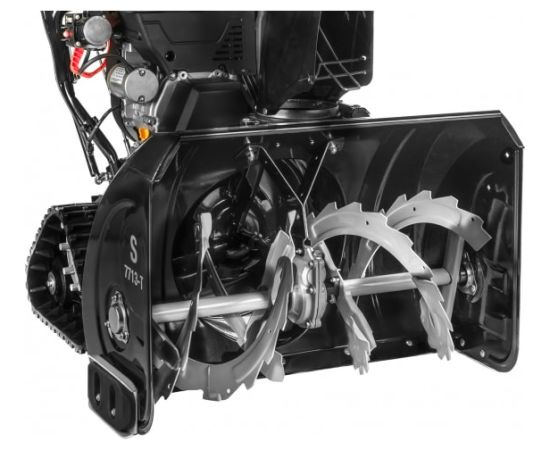 Снегоуборщик Hyundai S 7713-T перемещается при помощи гусениц, что значительно повышает проходимость и сцепление с поверхностью.