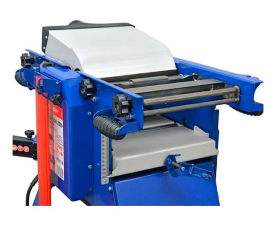 Однофазный двигатель обеспечивает высокую производительность станка. В конструкции предусмотрен патрубок для отвода пыли для поддержания чистоты рабочей зоны. Размер рейсмусового стола составляет 425х260 мм, что позволяет работать с габаритными заготовками.