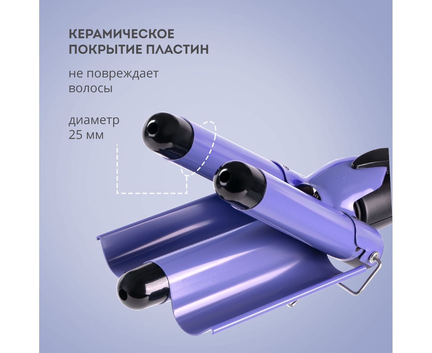 Рабочие поверхности диаметром 25 мм позволяют захватить большую прядь и моментально придать ей эффектную волну.