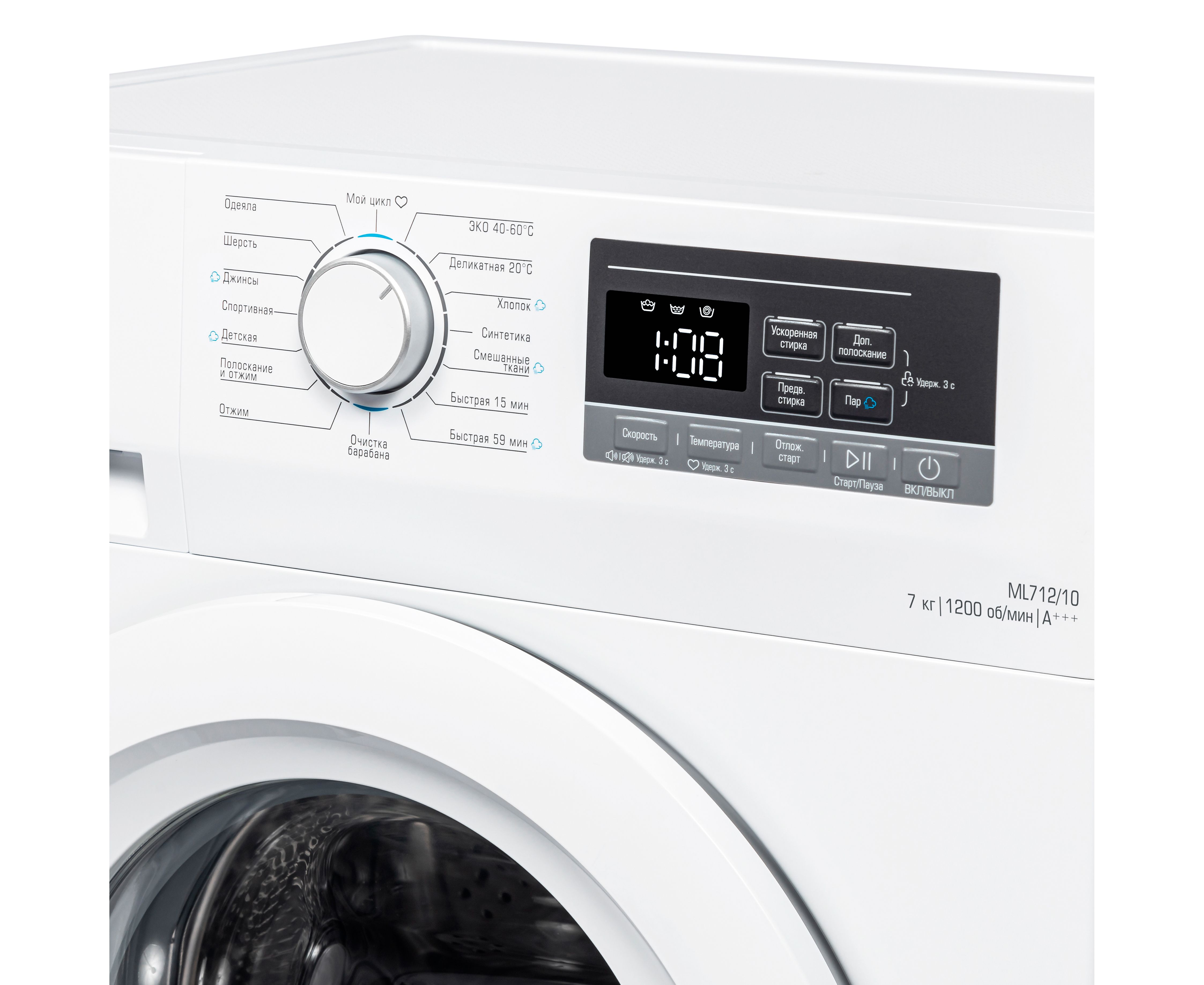 Дополнительные функции Выбор скорости отжима, Выбор температуры, Обработка паром, Предварительная стирка, Дополнительное полоскание, Блокировка от детей, Ускоренная стирка, Отложенный старт, Отключение звукового сигнала