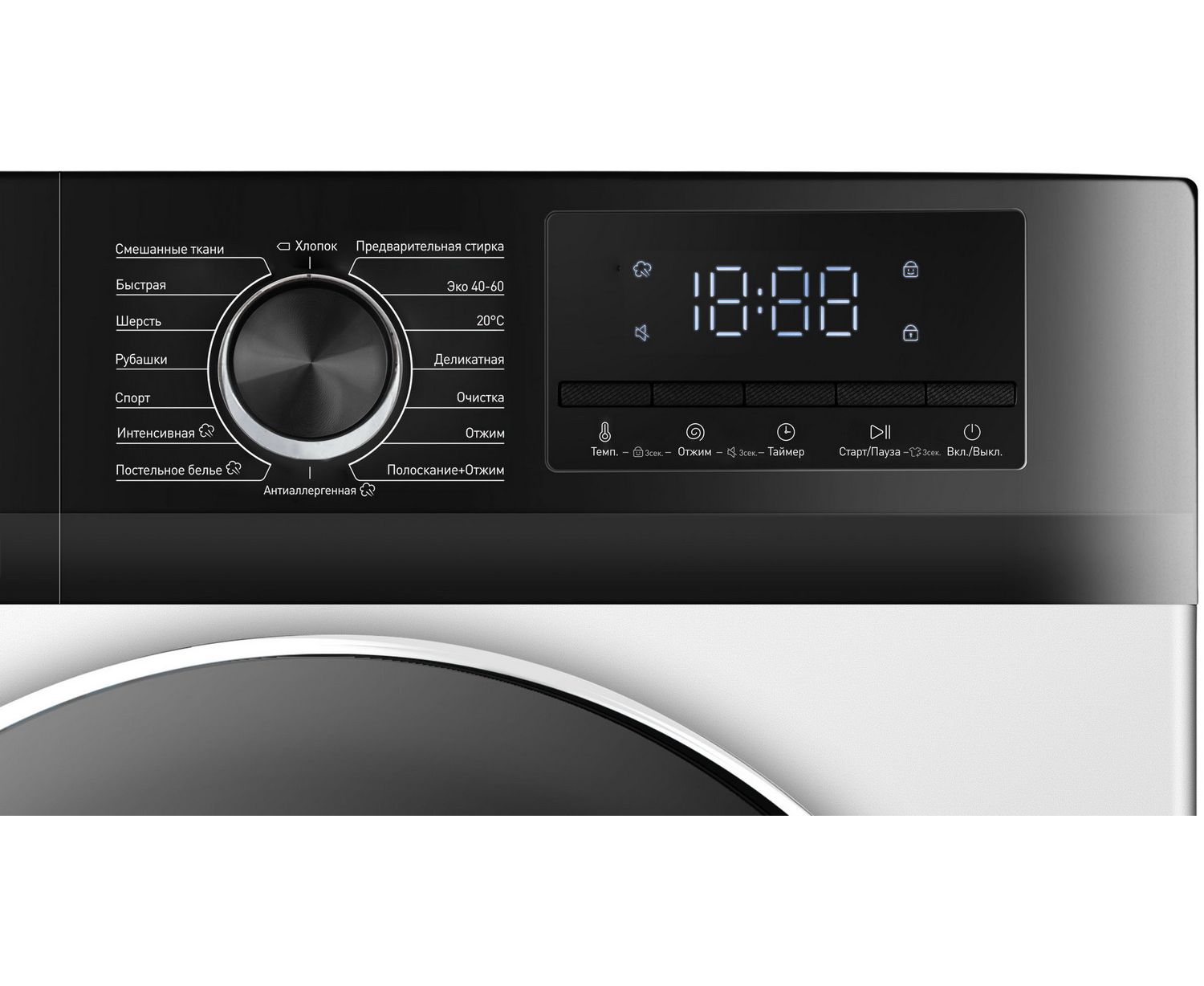 Автоматическая блокировка двери, защита от перелива, защита от перегрева, Автобалансировка барабана, Черная матовая панель управления, Большой премиальный люк с хромированным ободом
