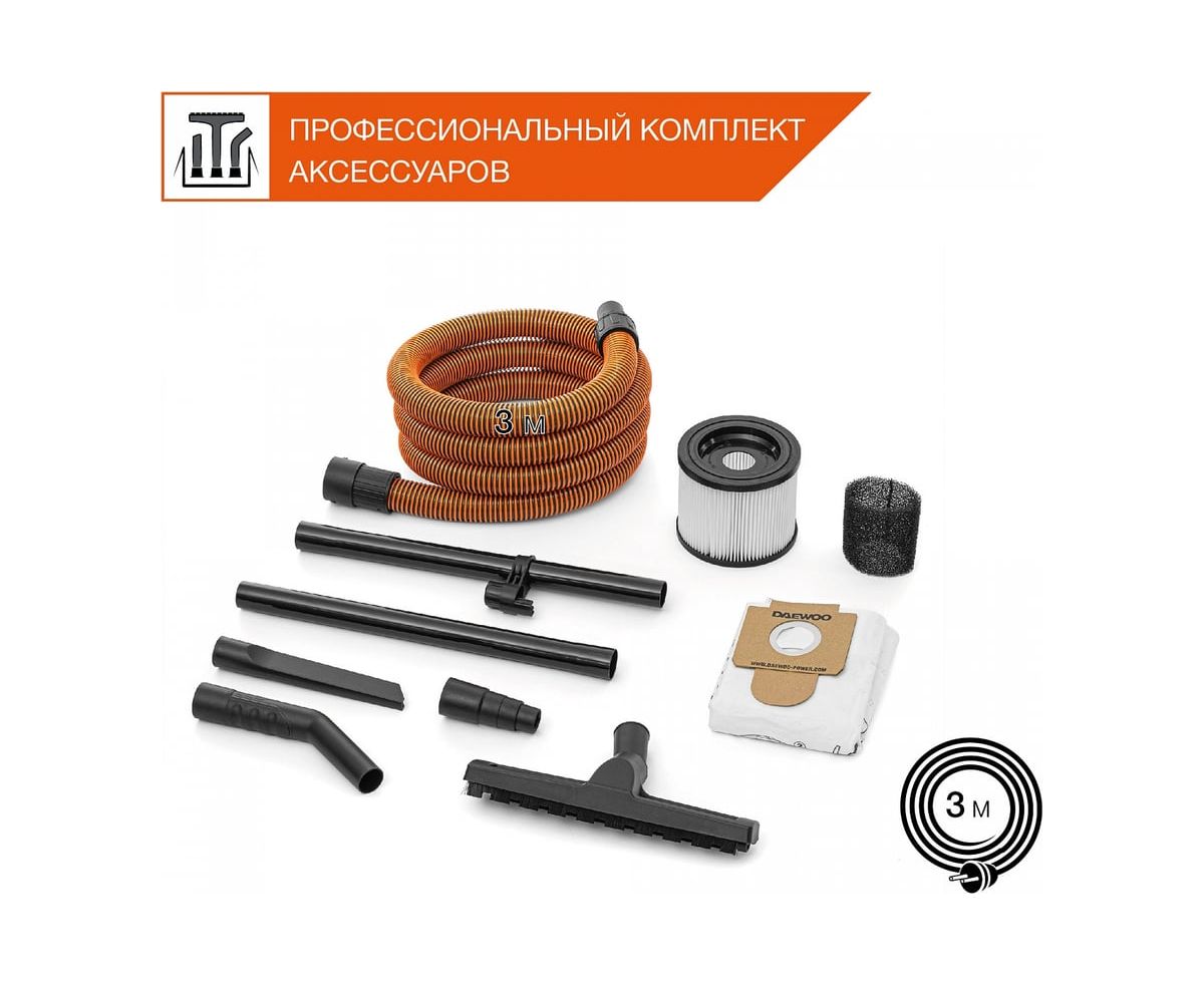 Строительный пылесос Daewoo DAVC 2014 1400Вт (уборка: сухая/сбор воды/выдув) оранжевый