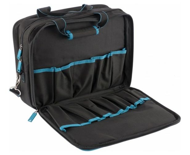 Сумка Gross Meister 90271, 400 х 170 х 300 мм, 31 карман, с отсеком для ноутбука и наплечным ремнем, удобна для переноски и хранения ручных инструментов. Подойдет мастерам по ремонту техники, слесарям, электрикам. Сумку можно брать в офис — в ней помещается ноутбук диагональю до 15 дюймов и бумаги формата А4. В сумке 31 карман и удобные фиксирующие резинки, поэтому каждый инструмент в ней всегда на своем месте.