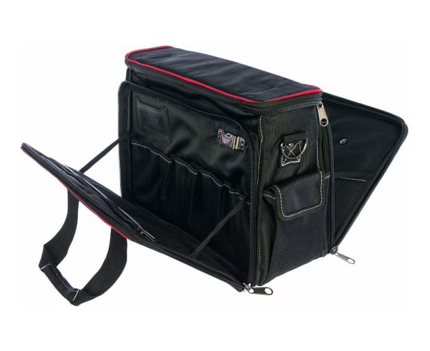 Сумка монтажника изготовлена из водонепроницаемого нейлона и обладает высокой прочностью. Имеет одно жесткое внутреннее отделение, два вместительных наружных кармана и откидывающиеся боковые секции с несколькими отделениями. Прошитые мягкие ручки обеспечивают удобство при переноске. Грузоподъемность сумки достигает 20 кг.