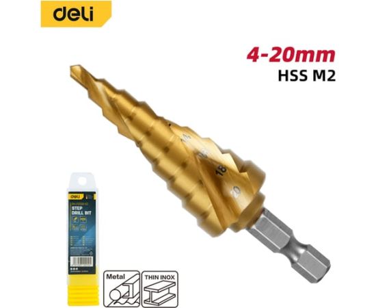 Сверло ступенчатое по металлу Deli DH-JTZ020-E2 4-20мм, HSS M2, спиральная канавка, шестигранный хвостовик