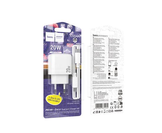 Сетевое зарядное устройство Hoco CS54A – это универсальное устройство, предназначенное для быстрой зарядки различных гаджетов. Оно оснащено одним USB-портом и одним Type-C портом, поддерживающим технологии Quick Charge 3.0 (QC3.0) и Power Delivery (PD), что обеспечивает быструю и эффективную зарядку.